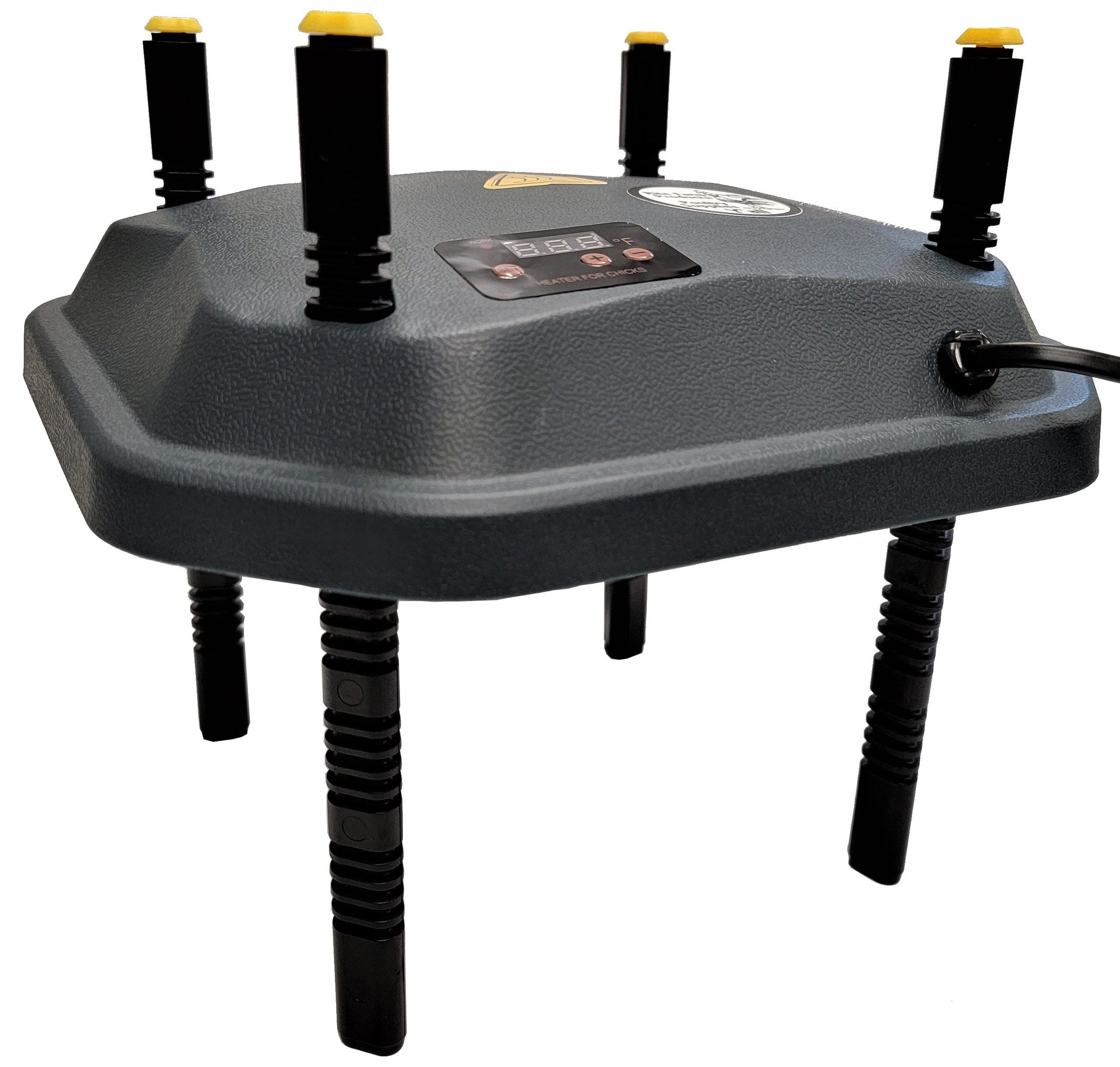 Rite Farm Products digital temperature adjustable 10 Inch by 10-inch 13-watt heat plate for baby chicks. Will warm up to 16 baby chickens, turkeys, ducks, guineas or geese, & up to 32 baby quail. Fully height adjustable for when your chicks grow with push button legs. 9-inch-long legs will adjust the underside of brooder plate from as little as 1.5 inches from the ground, up to 7 5/8 inches off the ground. Digital temperature controller allows you to adjust the temperature up or down based on your brooder setup and room temperature. Everyone's brooder setup will be different, and our brooder heat plates allow you to adjust everything for your precise brooder environment. Includes a 6 foot long 110-volt power cord.