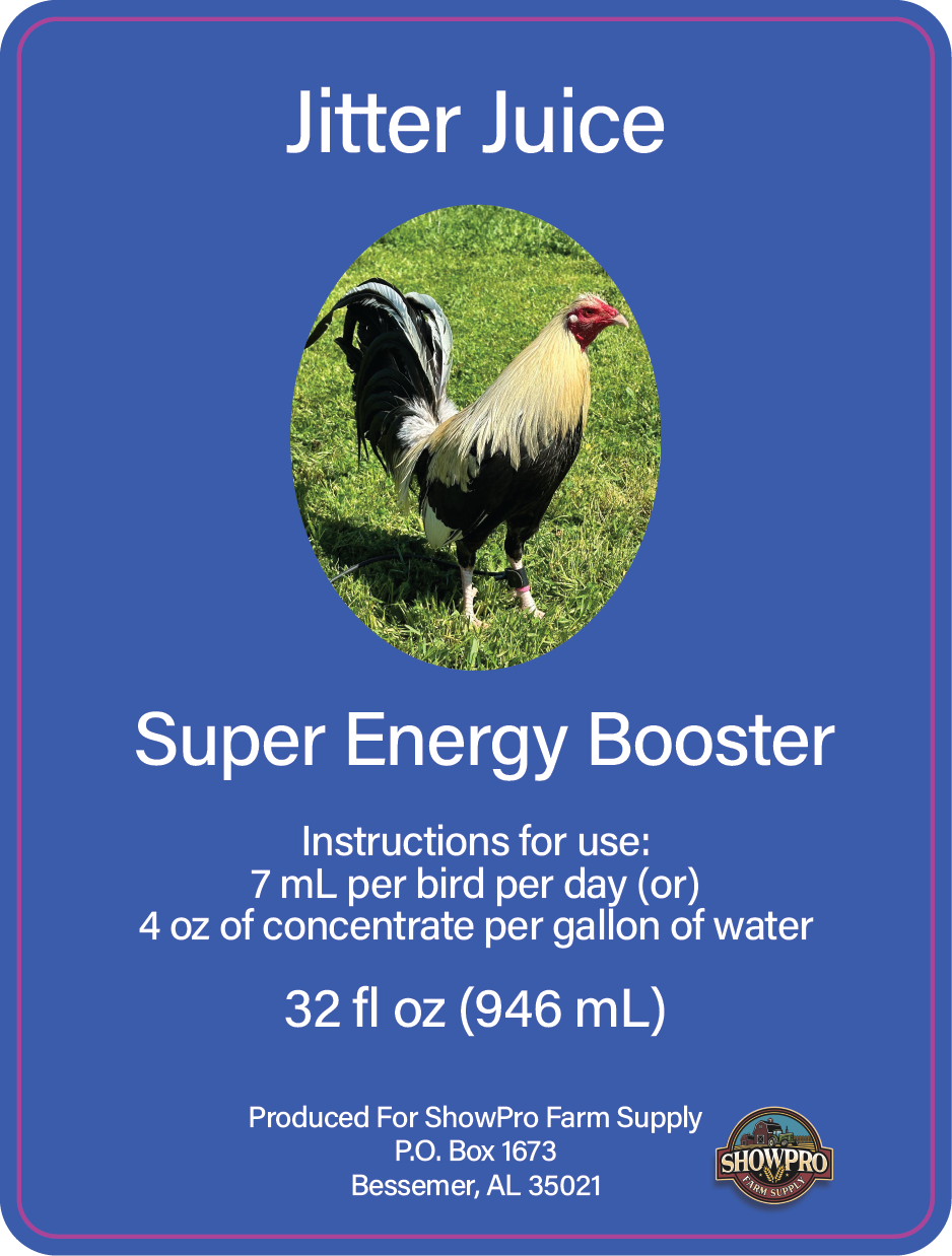Jitter Juice is a highly effective energy booster widely used in the Caribbean, Philippines, and Mexico, now available across the US. It aids in reducing stress, enhancing training and conditioning, and getting your rooster ready for top performance at shows. Use 4 oz. per gallon of drinking water or 7 ml per bird each day. For best effects, administer 30 to 45 minutes prior to the event. You'll see enhanced energy, alertness, and improved overall health in your birds.